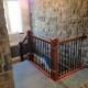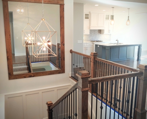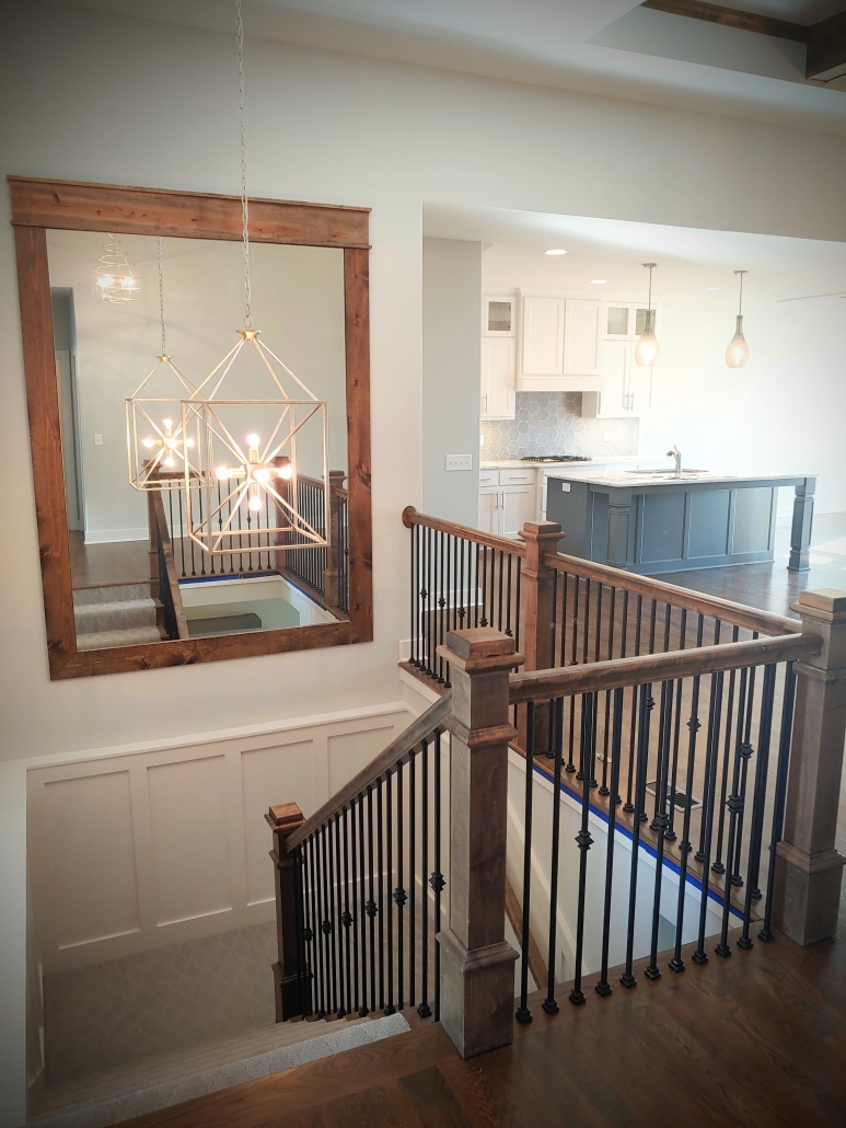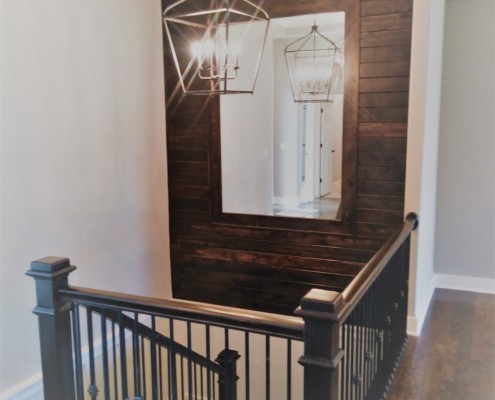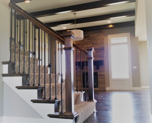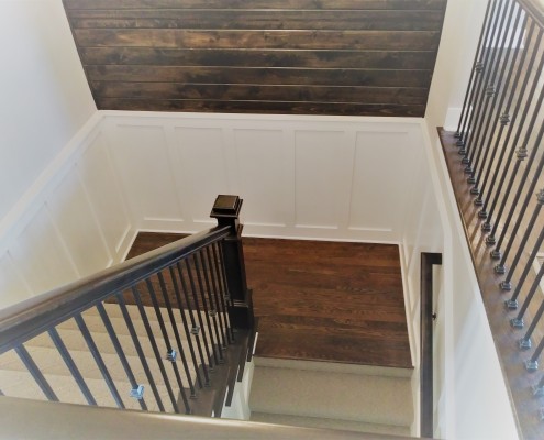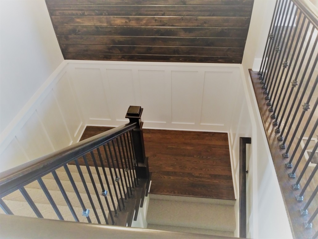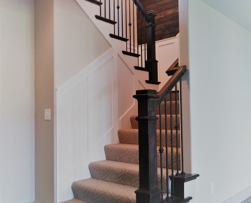 Depicted above are examples of stair cases we have done. This style of stair case uses iron spindles, end caps, and false risers to bring the stain on white look to life. Square white balusters can be used in place of the spindles if you are looking for a more contemporary style.